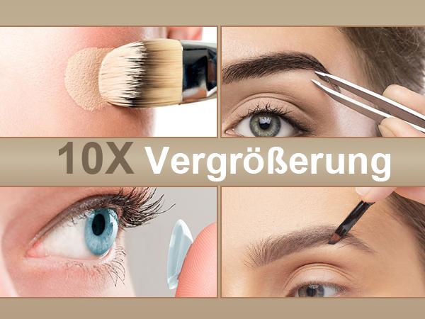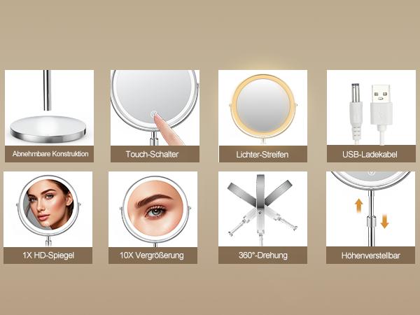 8 Zoll doppelseitiger Spiegel: Klassisches 1X /10X doppelseitiges Spiegeldesign, 1X Spiegel für allgemeines Make-up, 10X Vergrößerungsspiegel für detailliertes Make-up.10X Vergrößerungsspiegel kann für das Auftragen von Lippenstift, Augenbrauenfädeln, Kontaktlinsen, Gesichtsbehandlungen oder Mascara-Anwendung verwendet werden.WARME TIPPS: Wenn Sie die 10-fache Lupe verwenden, halten Sie bitte einen Abstand von 15 cm zum Spiegel, um Schwindel zu vermeiden.3 Farblichtmodi und stufenlose Helligkeit, dieser Schminkspiegel ist mit 72 Stück hellen LED-Leuchten ausgestattet, die mit 3 Lichtfarbmodi entworfen wurden: weißes Licht, warmes Licht und kühles Licht, das weiche Licht kann alle Ecken Ihres Gesichts abdecken.Drücken Sie kurz auf den Sensorschalter, um die Lichtfarbe zu ändern, drücken Sie lange, um die Lichthelligkeit einzustellen, erfüllen Sie alle Ihre Bedürfnisse in verschiedenen Umgebungen.