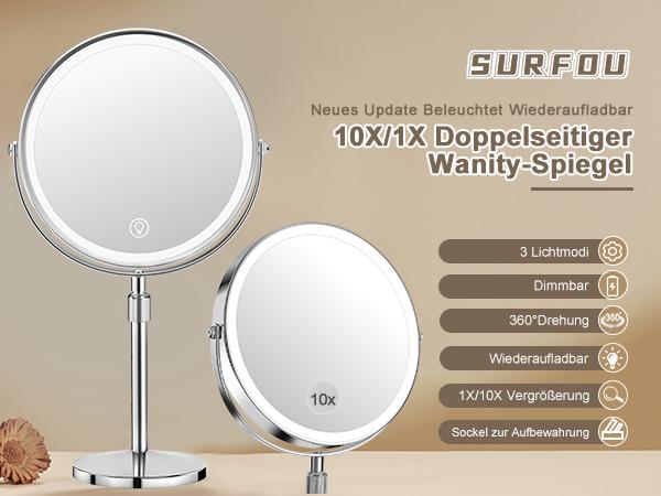 Höhenverstellbarer Schminkspiegel, höhenverstellbar von 14,9-18,9 Zoll, Sie können die bequeme Höhe finden, die Sie brauchen, passt sich jeder Höhe des Schminktisches an, ideal für zu Hause, auf Reisen und im Hotel.360° schwenkbares Design, schalten Sie zwischen 1x und 10x Vergrößerungsglas, lassen Sie leicht den Winkel finden, den Sie brauchen.